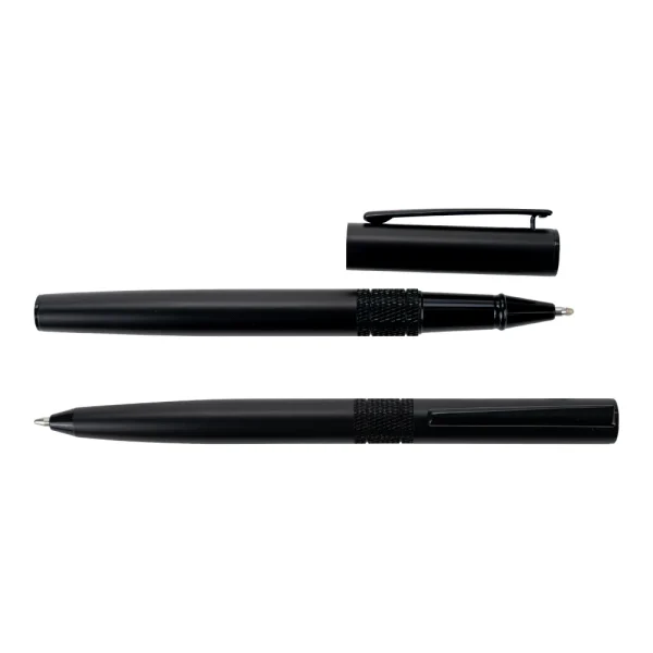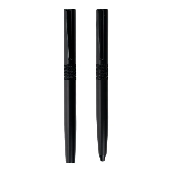 Showcase refined elegance with our Black Metal Pen Set featuring a premium matte finish and high-quality blue German ink. This sophisticated gift set includes a Roller Pen with a cap and a Ball Pen with a twist mechanism, both crafted from durable metal for a smooth and lasting writing experience. The set is beautifully presented in a Champagne-colored hardboard slide-to-open box with a soft velvet foam interior, making it a perfect choice for executive gifts, business promotions, and corporate branding.