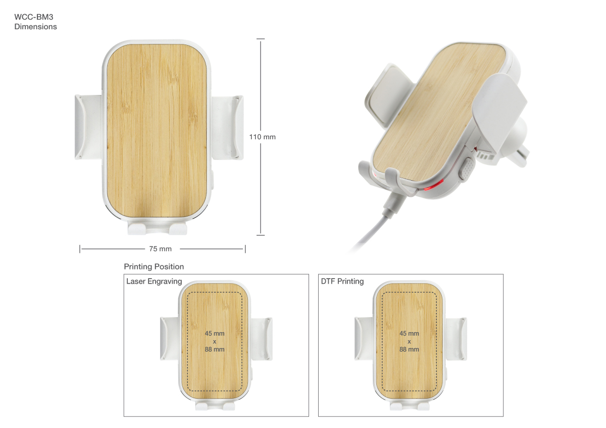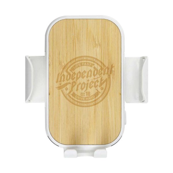 Recycled Plastic with natural Bamboo Finish Wireless Charger Car phone holder, and with branding options.