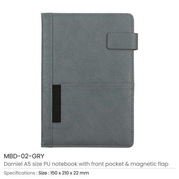 - A5 size with front pocket and magnetic closure