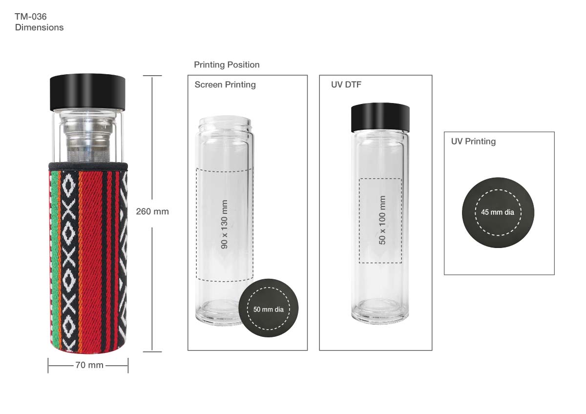 Double wall in high borosilicate glass bottles with SADU sleeve, 500ml with a black lid, and with tea infuser.