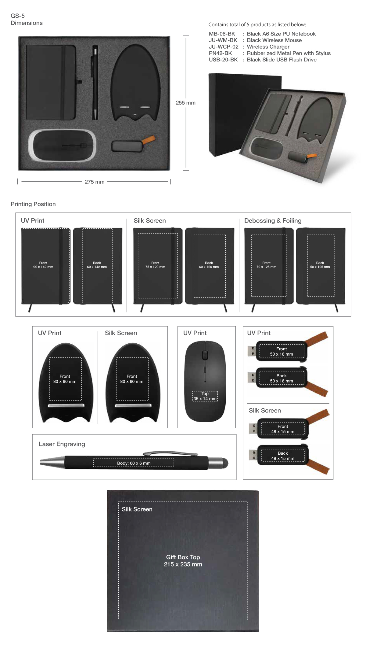 Gift Sets GS-5: Contains 5 products as listed beside and packed in a black cardboard box with a cushion inside for product protection and better presentation.
