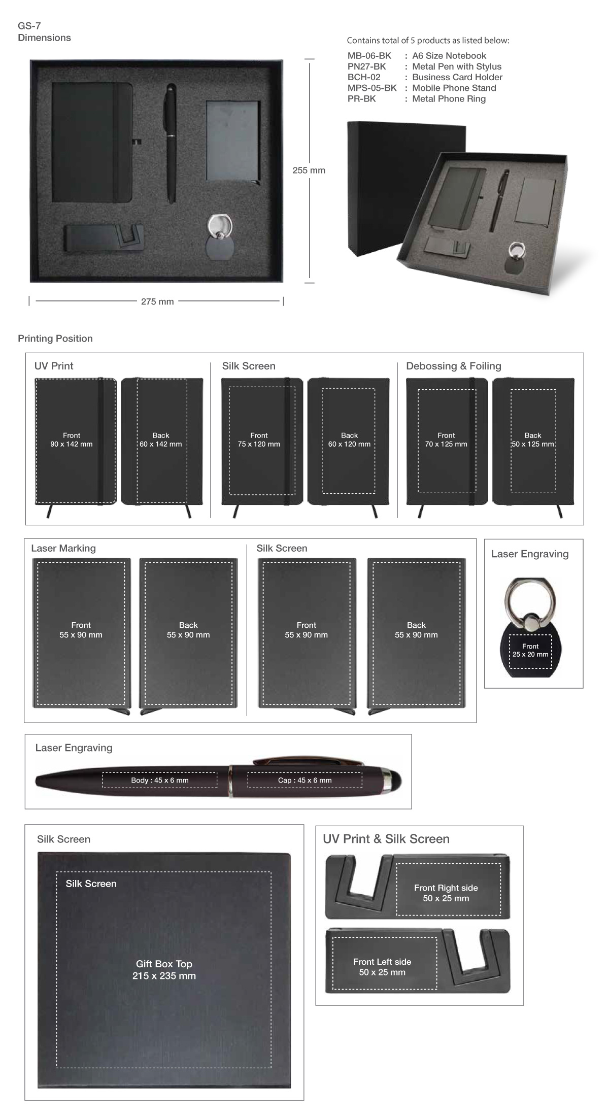 1. MB-06-BK: Black A6 size Notebook | 2. PN27-BK: Black Metal Pen with Stylus | 3. BCH-02: Business Card Holder | 4. MPS-05-BK: Black Mobile Phone Stand | 5. PR-BK: Black Metal Phone Ring